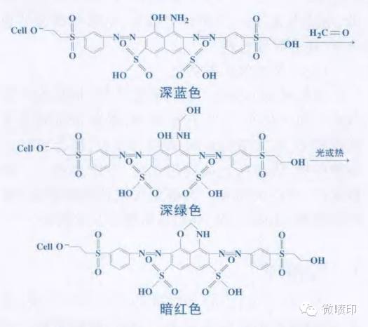 樹脂整理中,一些助劑釋放出的甲醛,能夠與H酸雙偶氮基的深藍、藏青染料發生化學結合,使發色體發生改變。 例如,C.I.活性黑5與甲醛變色反應過程為: