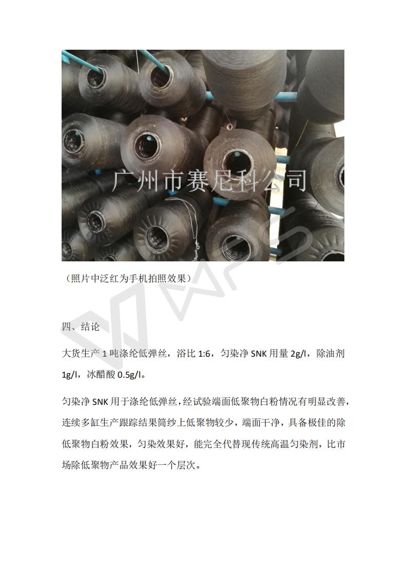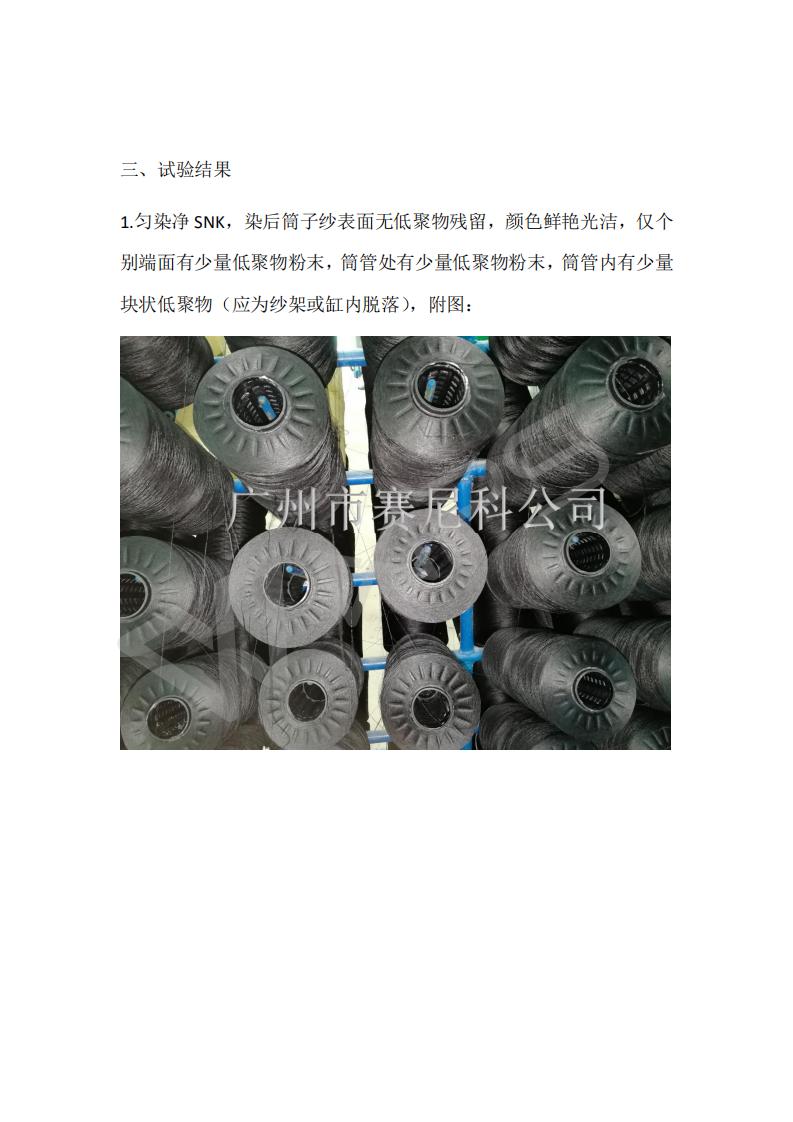 低聚物去除劑-勻染凈SNK代替傳統高溫勻染劑徹底解決筒子紗染色(特別是深寶藍丶藏青丶黑色等)產生的低聚物,避免產生白色粉末影響產品品質,避免產生各種色點色斑等疵病,色光純正,牢度好。