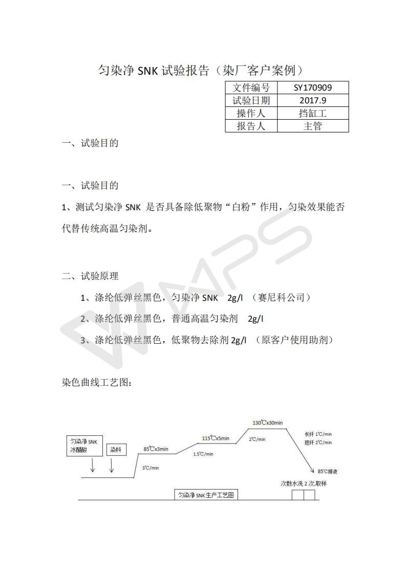 備注說明:根據實際工廠情況調整工藝與用量,如浴比1:6勻染凈用量初始建議2g/l(因缸中會殘留一部分低聚物,通過連續生產三缸以上清除低聚物殘留后,可相應降低勻染凈SNK用量,但也根據用水硬度,染料質量,纖維質量,洗缸次數等實際等情況作相應的調整。)