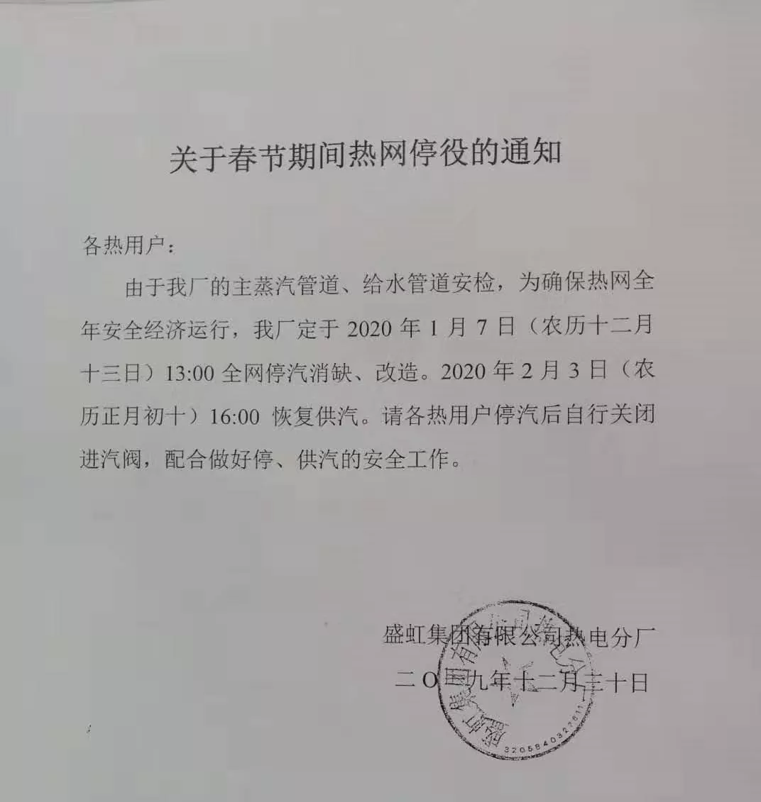 盛澤地區(qū)主要的熱電廠發(fā)出春節(jié)放假停汽通知,將于2020年1月7日13時全網(wǎng)停汽,2020年2月3日16時恢復(fù)供汽。