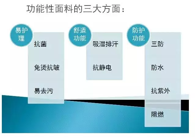 舒適類的功能性面料大致有這幾種功能:抗菌、除螨、防霉、抗病毒、防蚊蟲、阻燃、拒水拒油、防紫外線、吸濕快干、排汗、抗靜電等等。舒適類的功能性面料的生產技術早已成熟,也是服裝業目前運用最多的一類。