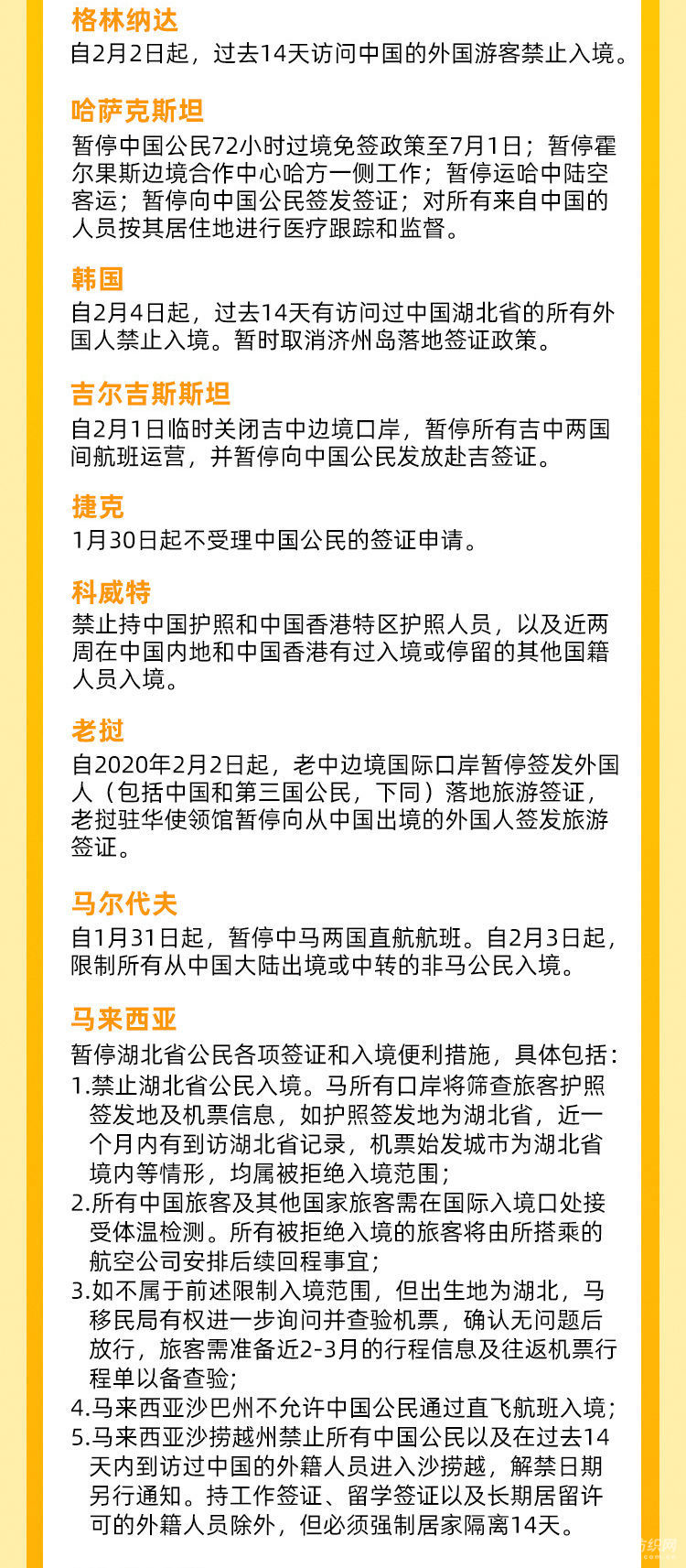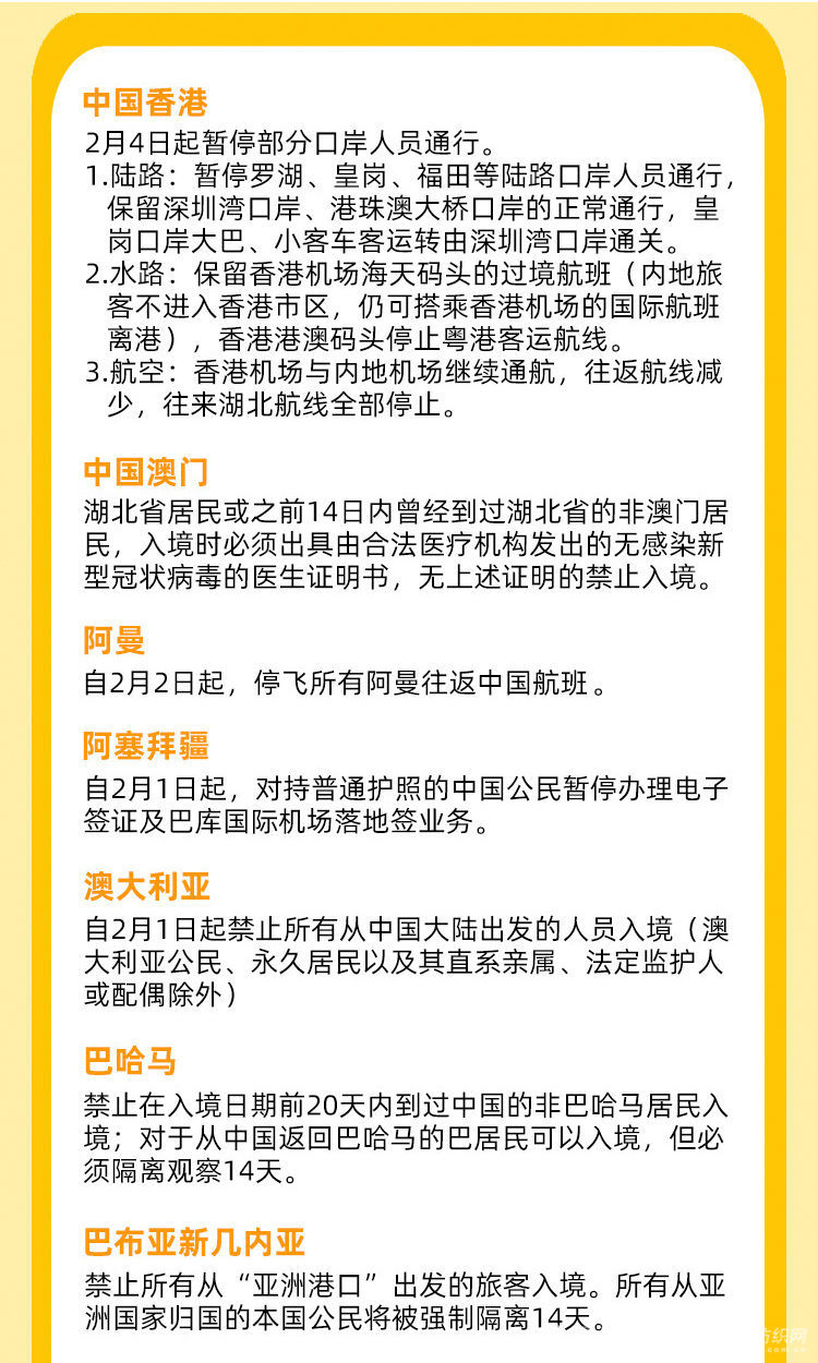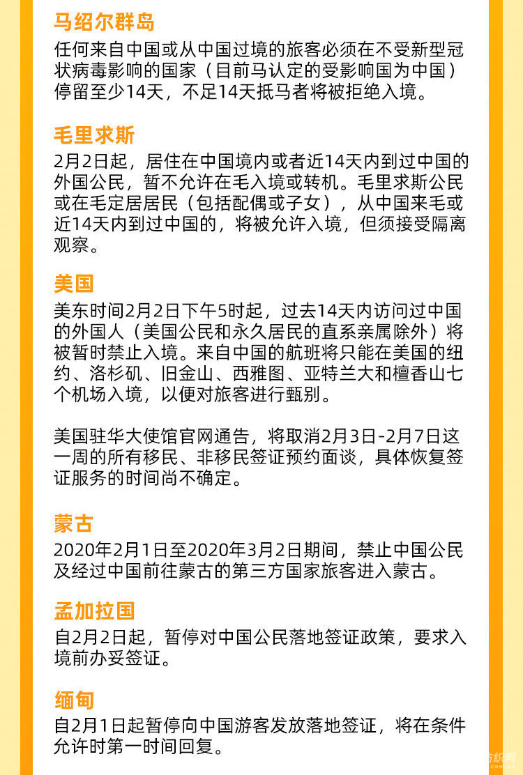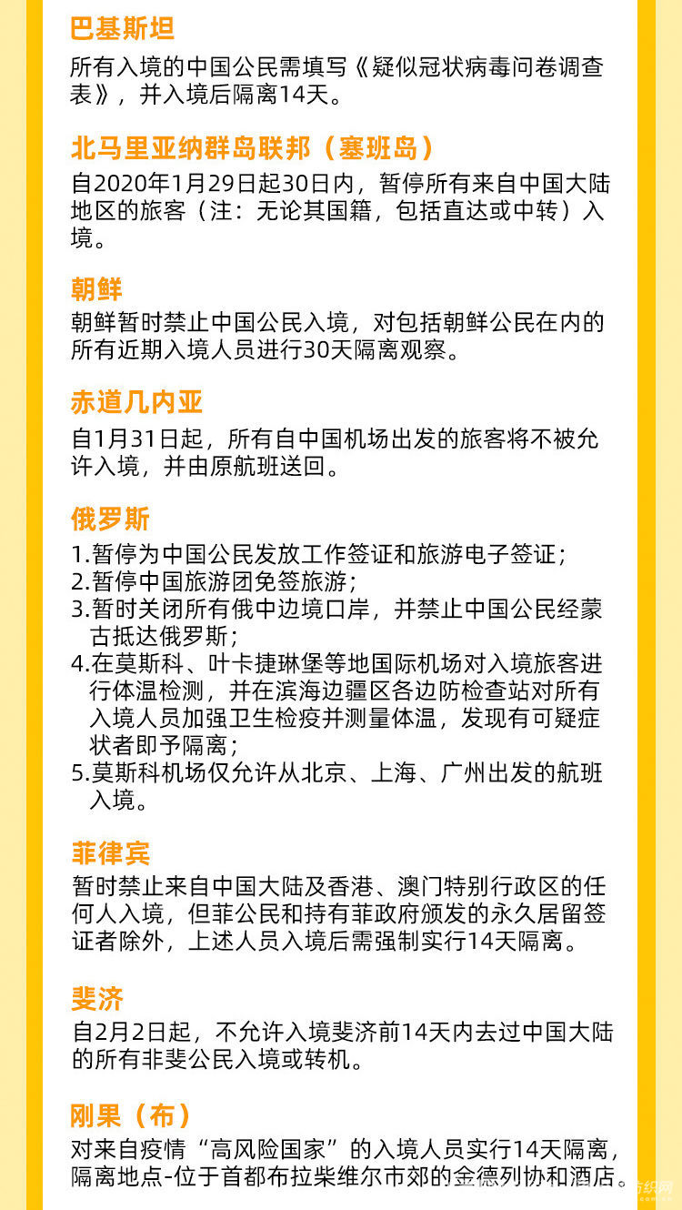 受突發新型冠狀病毒肺炎影響,除中國外,世界各國也相繼發現了確診病例,隨后多國多地陸續出臺了宣布針對中國旅客的入境管制政策,以下是最新世界各國和地區的入境限制政策: