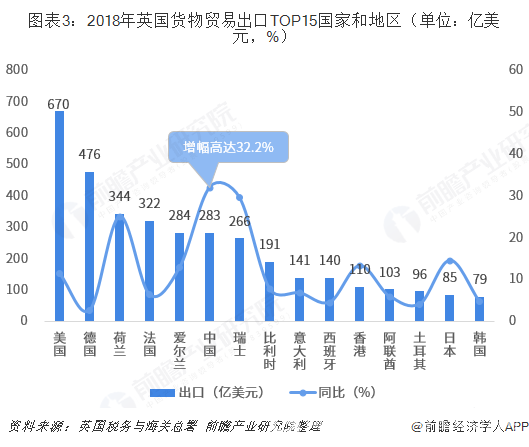 分國別(地區)看,2018年,英國出口市場較為依賴美國,出口額為670.4億美元,占英國出口總額的13.6%;其次,英國對德國、荷蘭、法國和愛爾蘭的出口額分別為476.5億美元、344.1億美元、322.3億美元和283.8億美元,分別占英國出口總額的9.6%、7.0%、6.5%和5.7%;中國緊跟其后,中國是英國第六大出口市場,出口額為283億美元,占比約5.7%。值得注意的是,2018年,英國出口TOP15國家和地區中,對中國的出口額增幅最高,達32.2%。