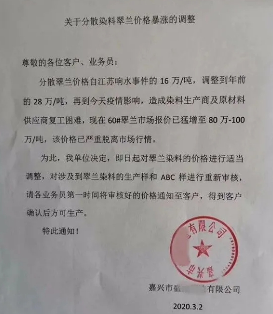 因此本單位即日起對翠蘭染料的價格進行適當調整,對涉及到翠蘭染料的生產樣和ABC樣進行重新審核!