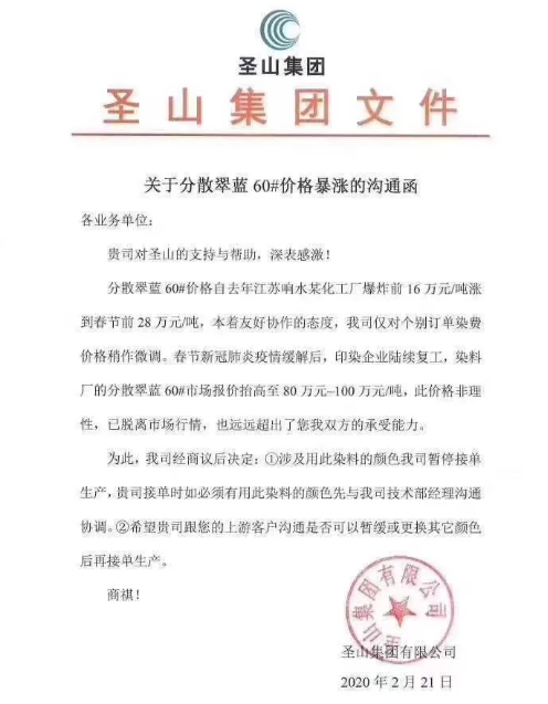 對于此次上漲,市場人士認為染料公司因疫情開工延后,年前訂單積壓,后續隨著印染廠家復工,對染料的需求將不斷放大,從而導致市場供需失衡。再加上從去年開始染廠對染料囤貨周期有所壓縮,更加會導致染廠對染料價格上漲的抗壓能力,那么當印染企業的生產成本增加卻無力支撐,只好轉嫁成本到下游,相應提高染費。