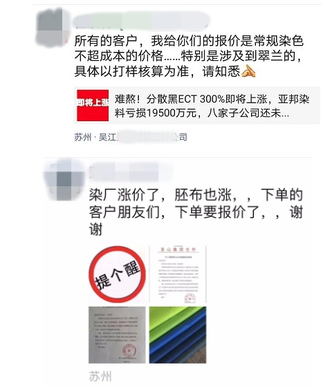吳江地區一貿易老板表示:“現在不敢多做深色和艷色的產品,除非客戶要求,因為超成本這塊吃不消。有些產品之前報價,利潤空間本身就不高,超成本這塊一加,利潤所剩無幾!”據了解,目前吳江地區染廠并未出臺漲價信息,但是已經有染廠表示涉及翠蘭產品前期報價或將作廢!