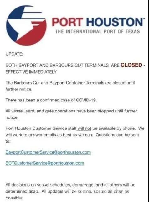 休斯敦港在官網發布消息表示,旗下兩個集裝箱碼頭發現員工確診新冠肺炎,將被臨時關閉。
