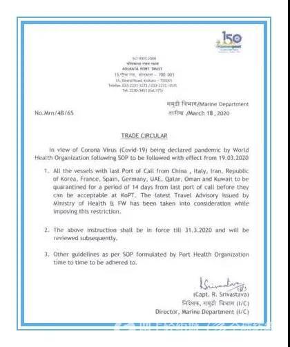 印度加爾各答港(Kolkata port)相關部門發布最新防疫指示,所有上一站停靠港為中國、意大利、伊朗、韓國、法國、西班牙、德國、阿聯酋、卡塔爾、阿曼和科威特的船只,必須接受為期14天的隔離檢疫(從離開最后靠泊港開始計算)后,才可以停靠加爾各答港進行作業。這一指示措施有效期至2020年3月31日,并在隨后進行審核考量。