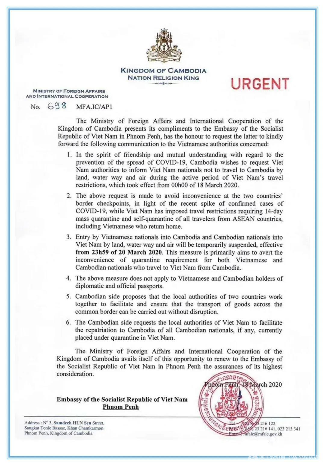 越南柬埔寨口岸關閉隨著越南采取措施控制新冠狀病毒傳播,越南政府于3月15日宣布將封鎖柬越邊境口岸,并對所有外國游客實施為期一個月的入境禁令(除派駐外交官)。柬埔寨外交部3月19日致函越南駐柬埔寨大使館,稱將關閉兩國邊境,不允許兩國人民越境,具體實施時間為3月20日晚23:59。在越南政府未通知柬方就關閉邊境大門后,柬埔寨政府隨即決定暫時關閉柬越邊境。不過此次禁令不針對持有外交護照的人。