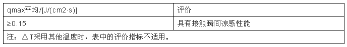 此標(biāo)準(zhǔn)可對樣品的接觸瞬間涼感進(jìn)行評價(jià),△T=15℃時(shí)評價(jià)指標(biāo)見下表。